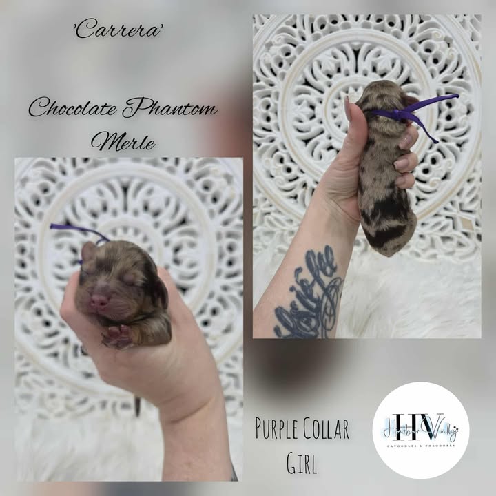 Carrera is a breathtaking Chocolate Merle Phantom Cavoodle with striking, one-of-a-kind markings that make her truly unforgettable. She’s a shining example of the Cavoodle’s charm — a mix of beauty, intelligence, and a gentle nature that makes this breed so loved.
