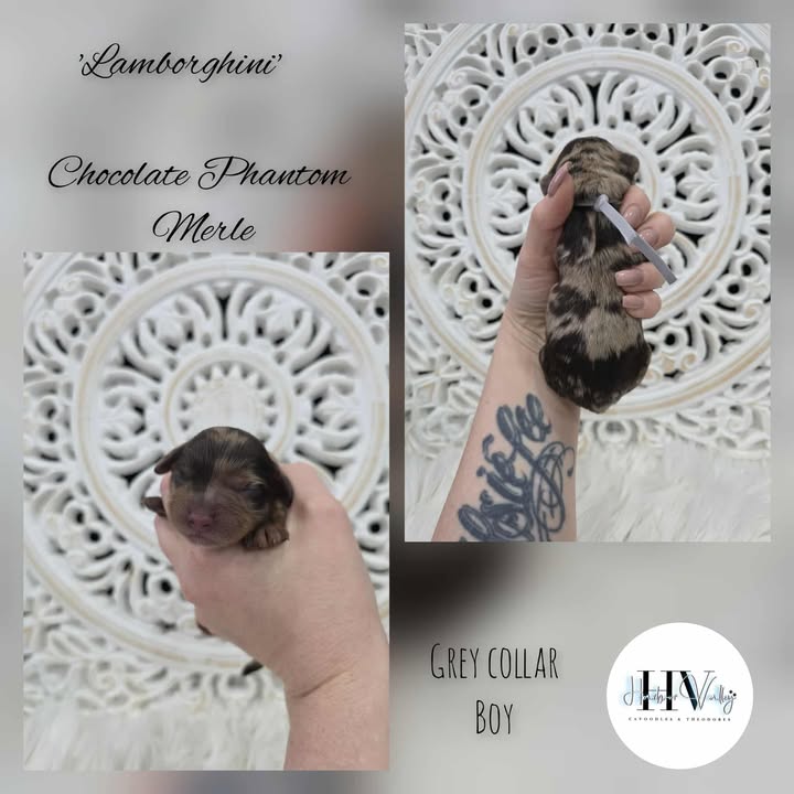 Lamborghini is a breathtaking Chocolate Phantom Merle Cavoodle, boasting a coat that’s as rare and luxurious as his name suggests. With his striking merle pattern layered over rich chocolate tones and highlighted by classic phantom markings, he’s nothing short of spectacular.