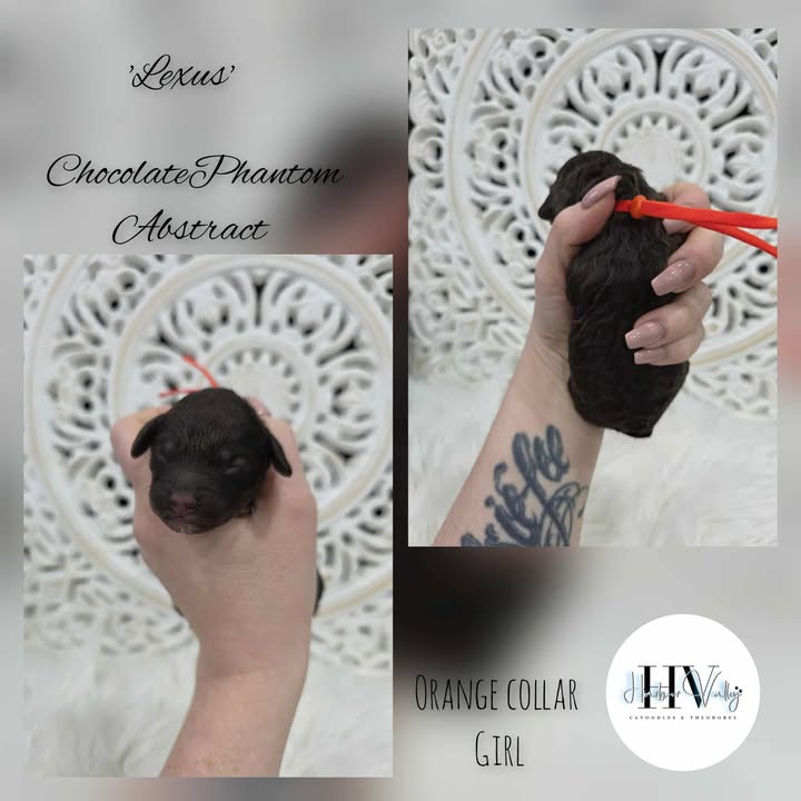 Lexus is a gorgeous Chocolate Phantom Abstract Cavoodle with an elegant, eye-catching presence. Her coat blends deep chocolate shades with distinctive abstract markings, creating a rare and sophisticated look.