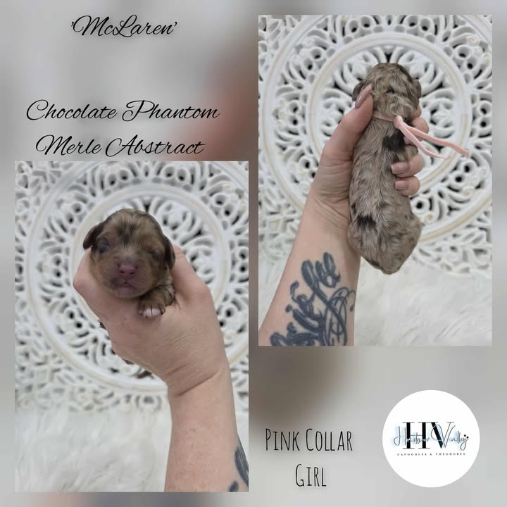 McLaren is an extraordinary Chocolate Phantom Merle Abstract Cavoodle, boasting a coat that is as rare as it is breathtaking. Her rich chocolate tones are beautifully enhanced by the unique merle pattern and abstract markings, creating a one-of-a-kind masterpiece.