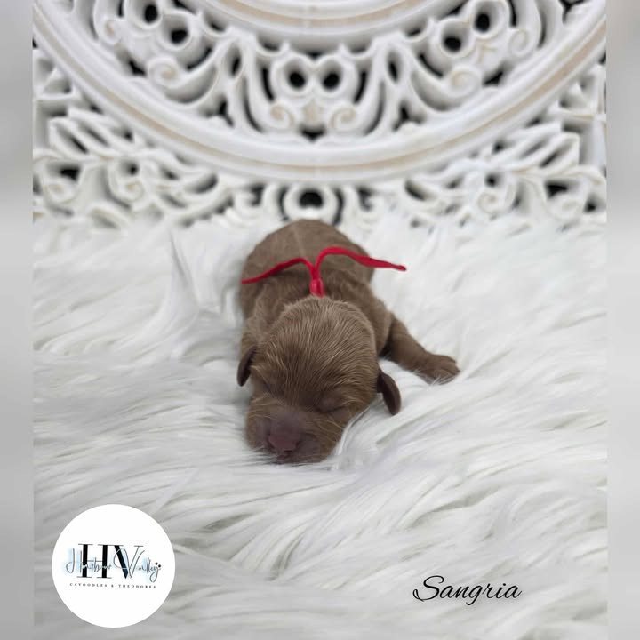 Mini Theodores are known for their affectionate nature, intelligence, and family-friendly temperament. With her stunning solid red colouring and silky fleece coat, Sangria promises to grow into a loving and loyal lifelong companion.