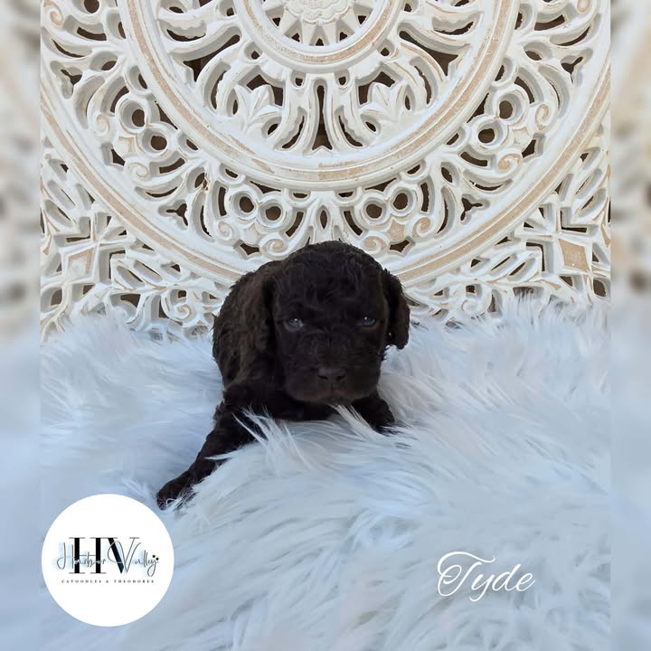 Tyde is a delightful little pup with a soft, cuddly early coat and a gentle, charming presence. At just 8 weeks old, he’s thriving wonderfully and already showing the promise of growing into a bright, affectionate, and loyal companion.